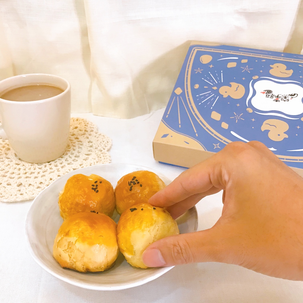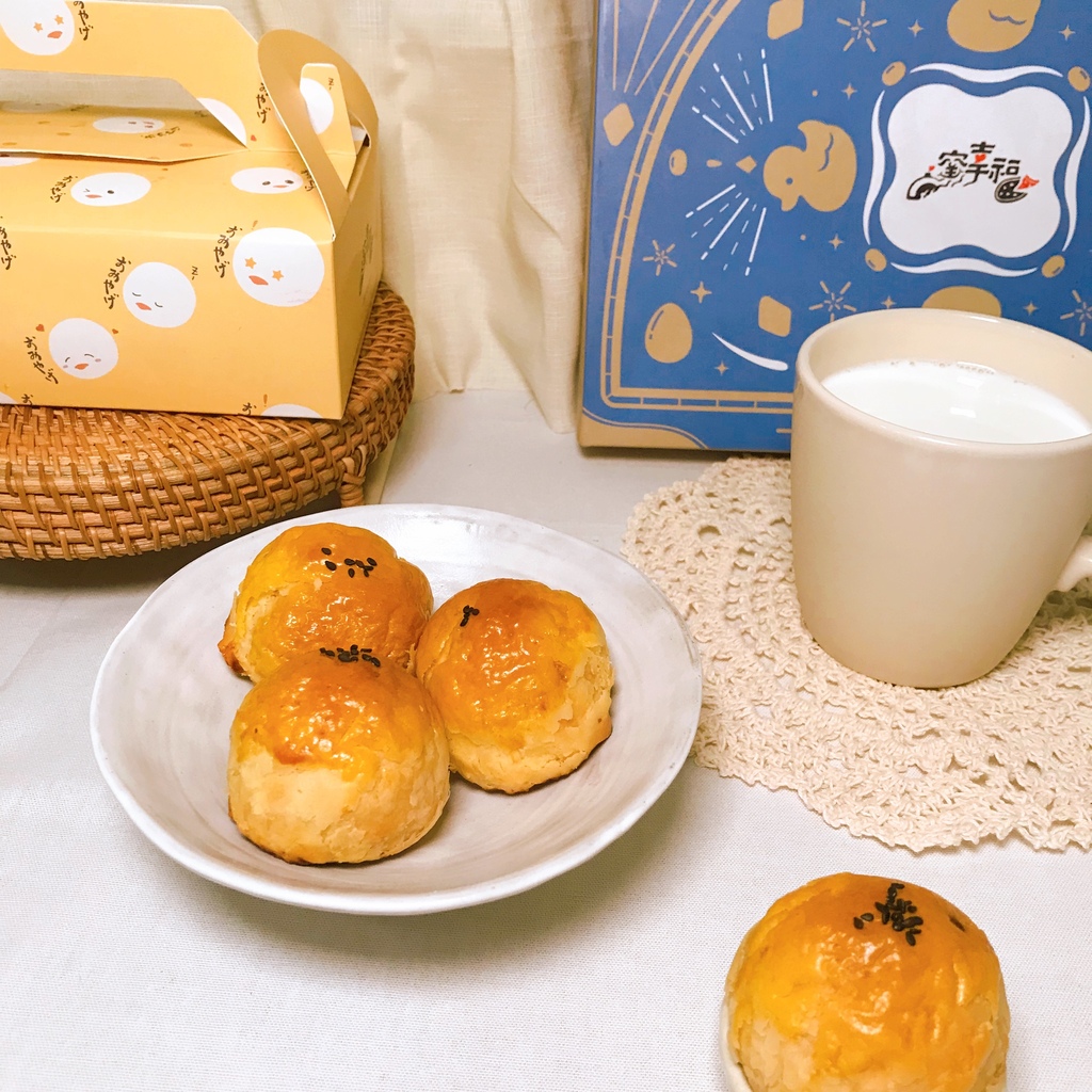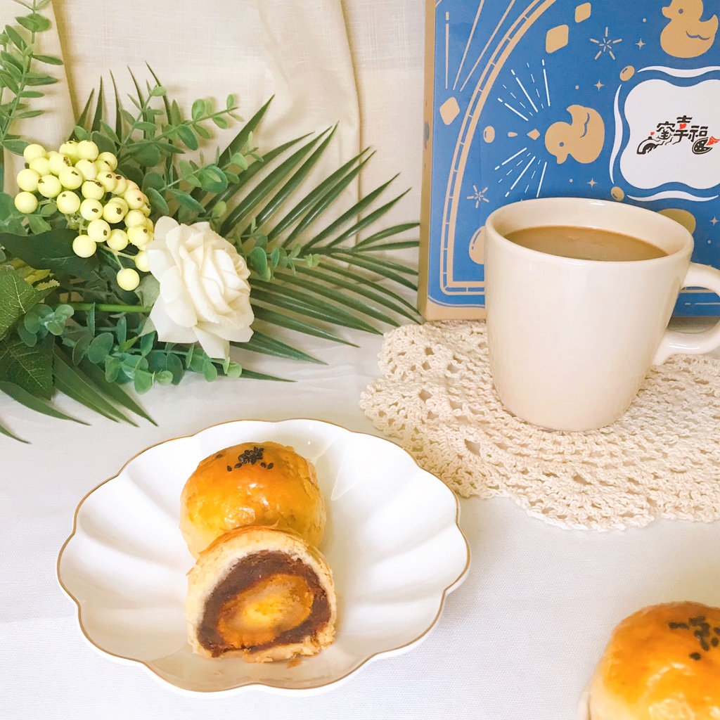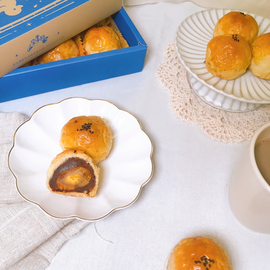 窯幸福使用新鮮的鴨蛋黃及不甜膩的紅豆餡來製作蛋黃酥,老闆有跟我們提到他們的蛋黃酥皮是一折再折的折疊在一起,油皮包覆著油酥,經過反覆的捲疊和壓緊。所以在品嚐的時候會感覺到一層一層很酥的千層外皮,吃起來的口感很不錯。