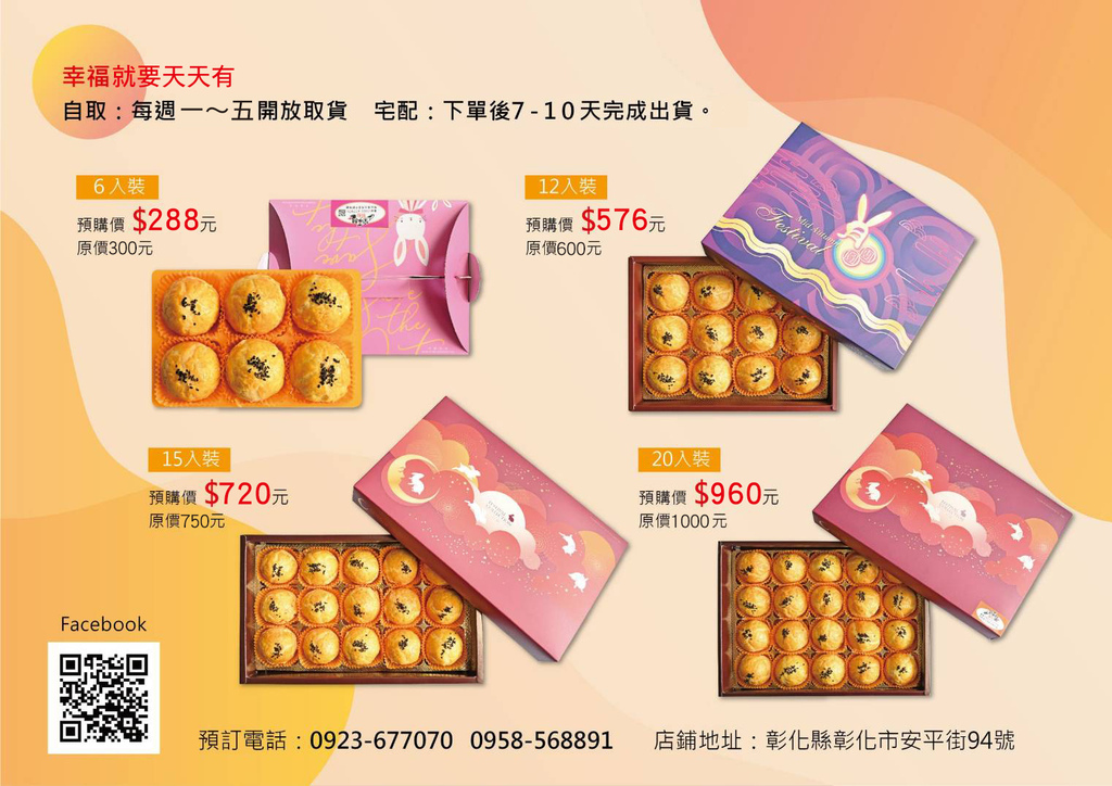 中秋節的期間,窯幸福推出了6入裝、12入裝、15入裝及20入裝,詳細資料如下圖,蛋黃酥現在必須提前預訂,因為他們的販售時間有所限制。通常只能在週三、週四和週五有機會購買,而在中秋節期間,他們每天都會有限量供應,建議提前預訂,這樣比較保險!